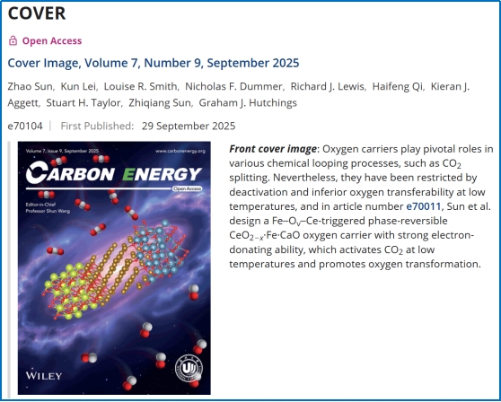 孙志强教授团队在国际权威期刊《碳能源》(Carbon Energy,IF: 24.2)上发表了题为“调制Fe-Ov-Ce触发的可逆相变载氧体以增强化学链CO2裂解”(Tailoring Fe-Ov-Ce triggered phase-reversible oxygen carrier for intensified chemical looping CO2 splitting)的研究论文,并被选为期刊封面论文。孙朝副教授、2021级博士生雷坤为共同第一作者,孙志强教授、英国卡迪夫大学Graham J. Hutchings教授为共同通讯作者,日本无码a片